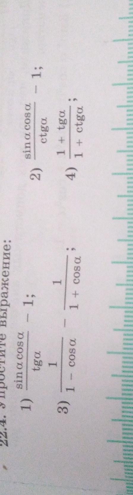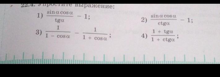 22.4. Упростите sin a cos a 1) 3) tga 1 1 - cos a выражение: - 1; 1 1 + cosa 2) 4) sin a cos a ctga 1 + tga 1 + ctga ; - 1;