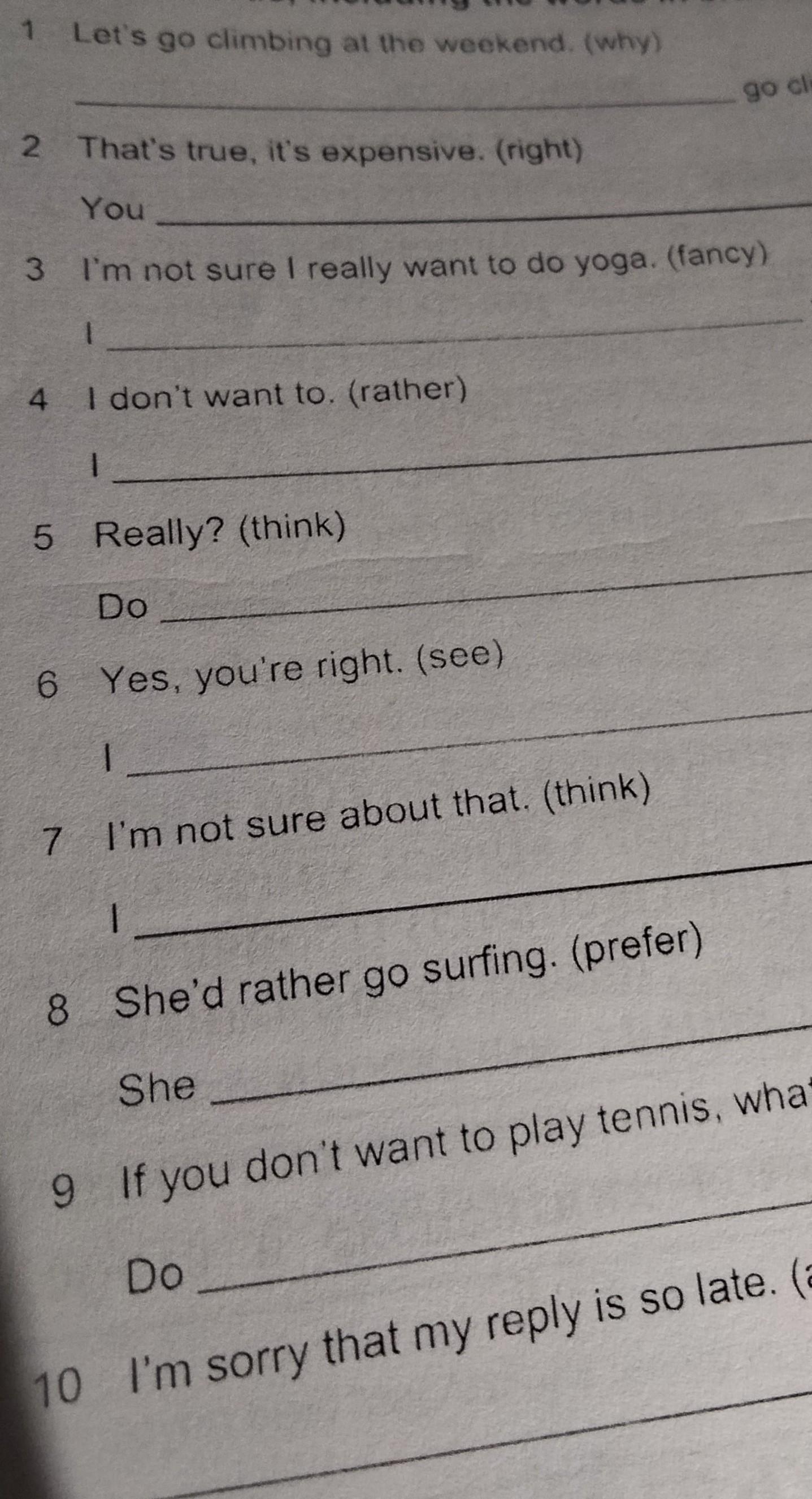 1. Let’s go climbing at the weekend. (why) dont we go climbing at the weekend?