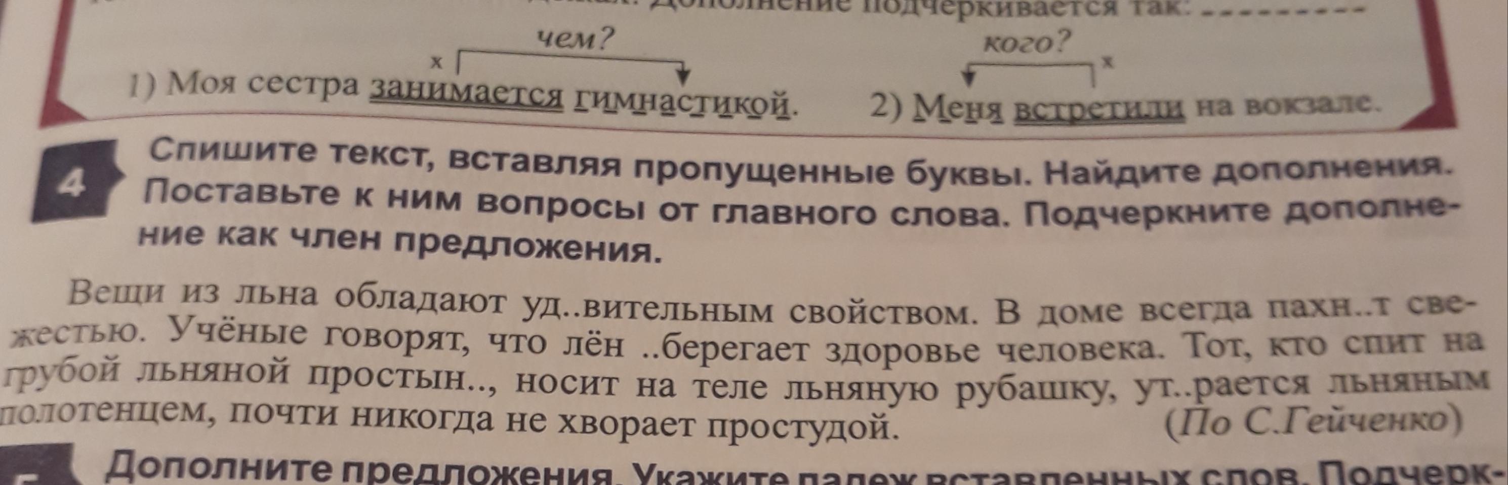 Вещи из льна обладают удивительным свойством. (Обладают чем? Свойством - дополнение) В доме всегда пахнет свежестью. (Пахнет чем? Свежестью - дополнение) Учёные говорят, что лён оберегает здоровье человека. (Оберегает что? Здоровье - дополнение) Тот, кто спит на грубой льняной простыне, носит на теле льняную рубашку, утирается льняным полотенцем, почти никогда не хворает простудой. (Спит на чём? На простыне; носит что? Рубашку; утирается чем? Полотенцем; не хворает чем? Простудой - дополнения)