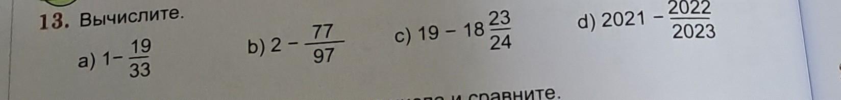 а) 1-19/33=14/33 в) 2-77/97=1 20/97 с) 19-18 23/24= 1/24 д) 2021-2022/2023= 2020 1/2023