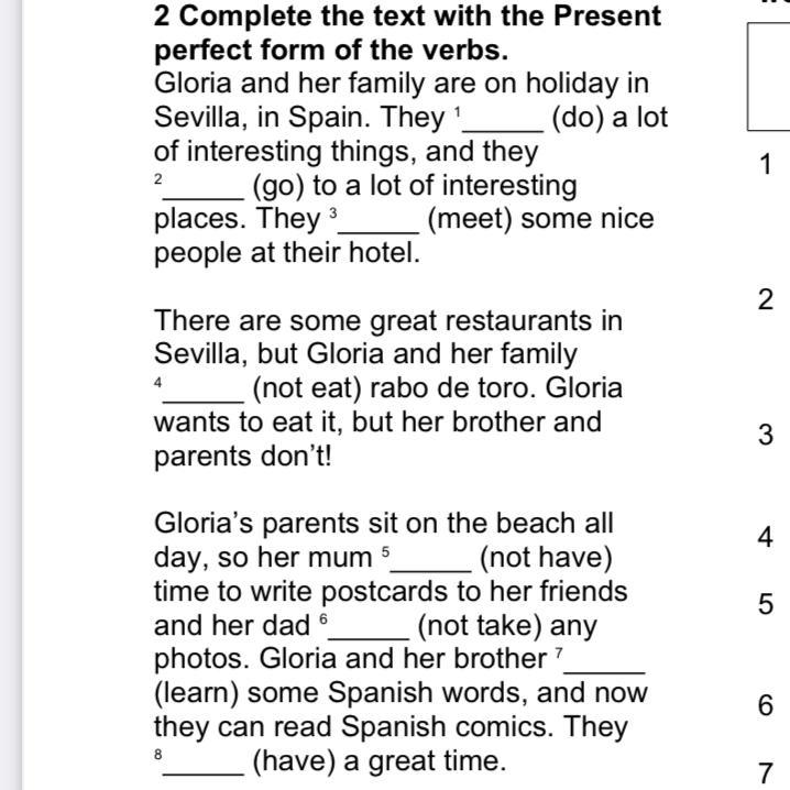 Gloria’s parents sit on the beach all day, so her mum 5 (not have) time to write postcards to her friends and her dad 6 (not take) any photos. Gloria and her brother 7 (learn) some Spanish words, and now they can read Spanish comics. They