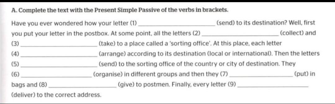 Have you ever wondered how your letter (1) is sent to its destination? Well, first you put your letter in the mailbox. At some point, all letters (2) are collected and (3) taken away to a place called "sorting office". At this point, each letter (4) is arranged according to the destination (local or international). Then letters (5) are sent to the sorting office of the country or city of destination. They (6) are organized into different groups and then they (7) are put in bags and (8) given to postmen. Finally, each letter (9) is delivered to the correct address.