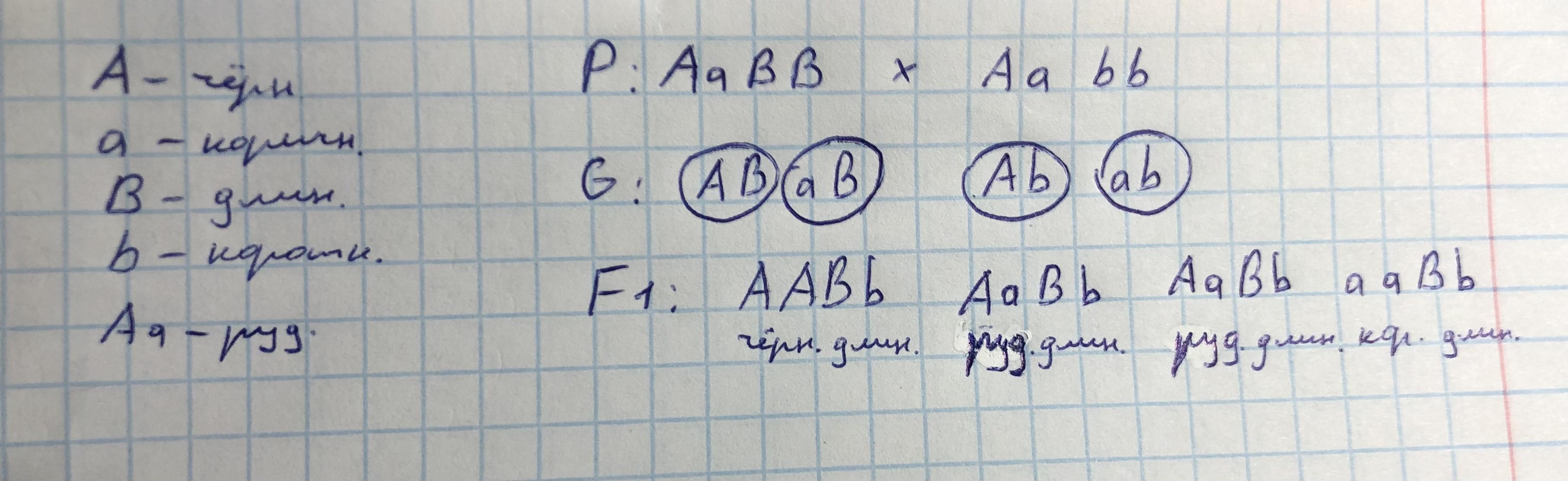 У мишей чорне забарвлення хутра домінує над коричневим, а довгі вуха - над короткими. Яких нащадків слід чекати від схрещування рудої миші з довгими вухами, гомозиготної за довжиною вух, з чорною гетерозиготною з короткими вухами?