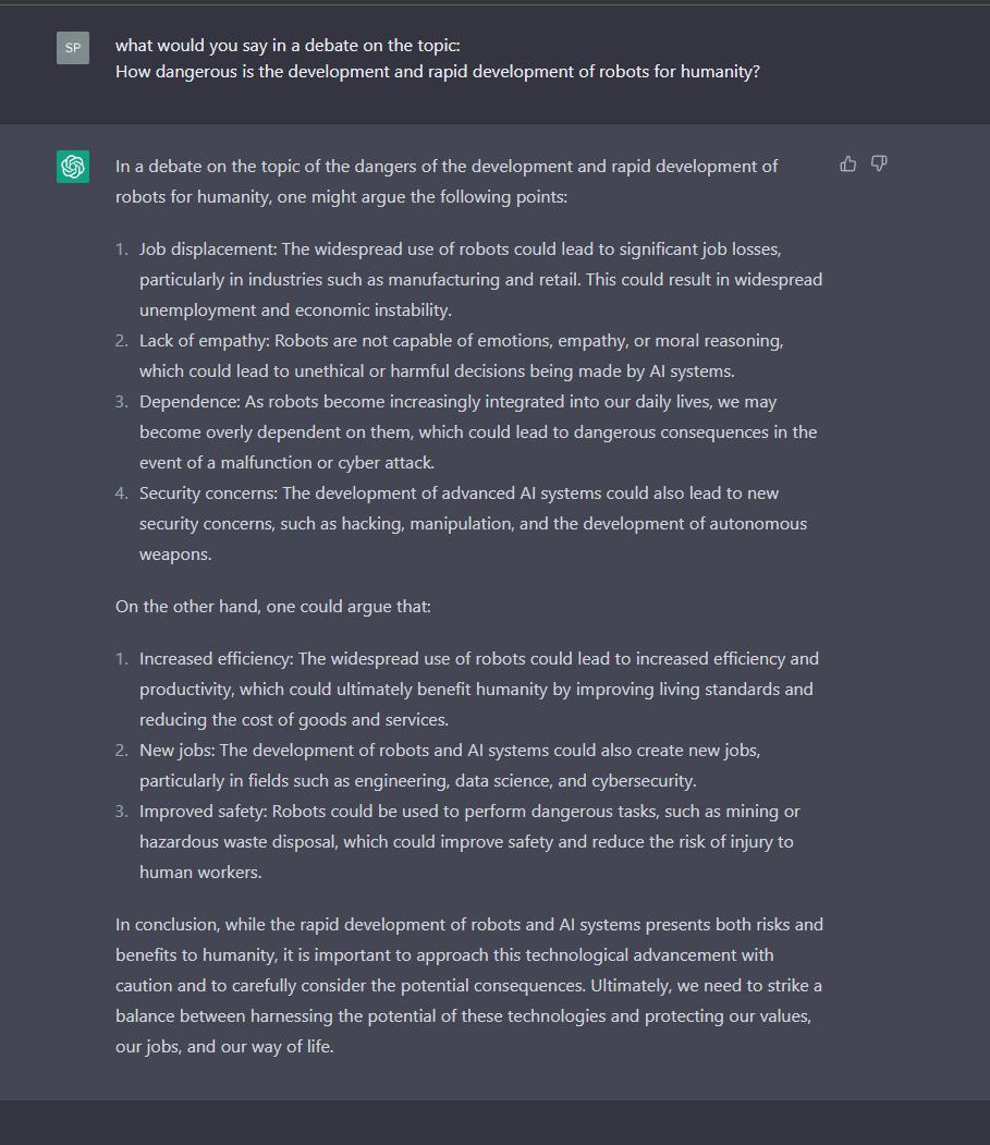 Подготовься к дебатам на тему «Насколько опасны разработка и быстрое развитие роботов для человечества?», ответи пж