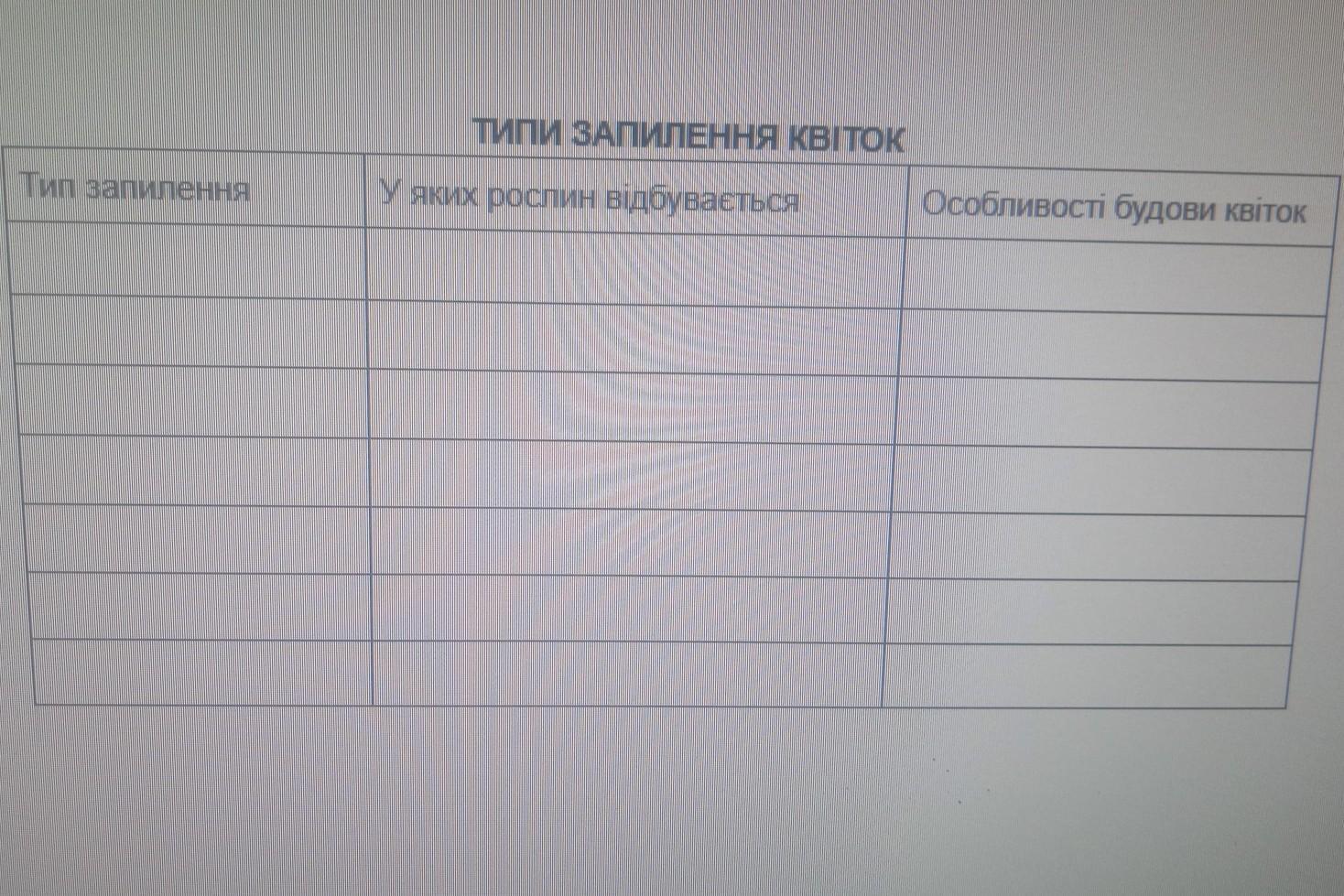 Відповідь:Типи запилення: вітром та комахами, У яких рослин - квіток. Особливості будови - мають тичинки й маточки