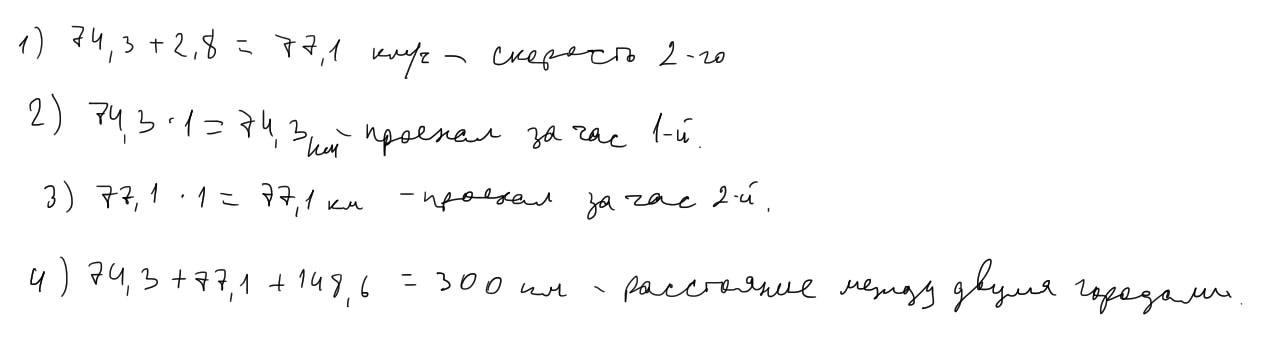 1228. Iз двох міст назустріч один одному одночасно виїхали два автомобiлi. Швидкість одного з них була 74,3 км/год, а швидкість другого на 2,8 км/года бiльша. Знайди відстань між містами, якщо через годину відстань між автомобілями становила 148,6 км.