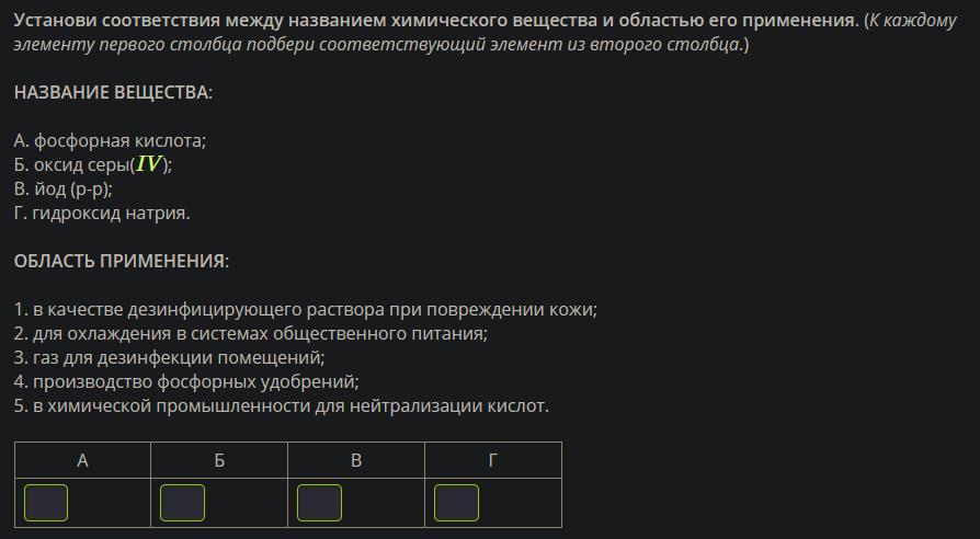 Установи соответствия между названием химического вещества и областью его применения. (К каждому элементу первого столбца подбери соответствующий элемент из второго столбца.)
