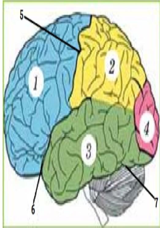 Визначте назви елементів будови півкуль головного мозку зображених цифрами 1 - 7.