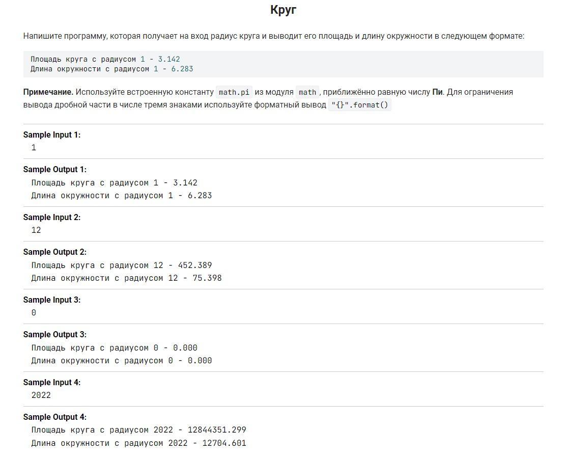 "Площадь круга с радиусом {0} - {1:.3f}\n"