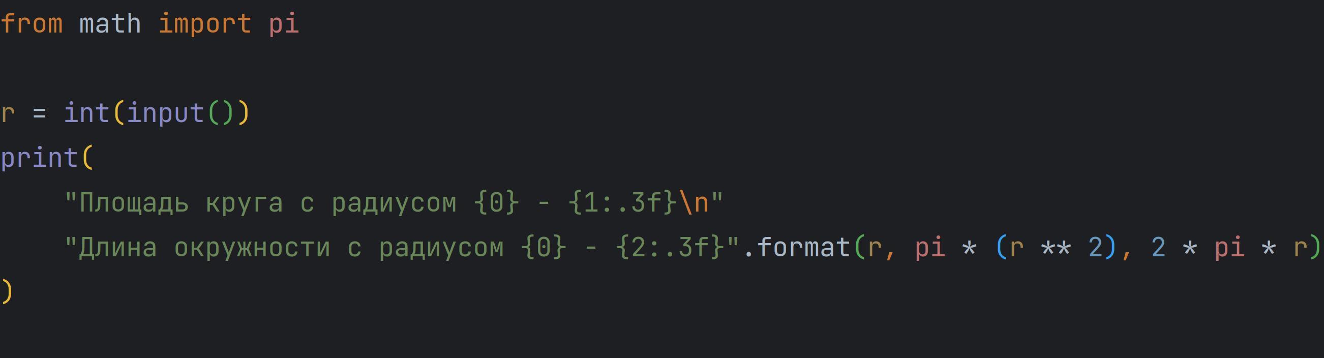 "Длина окружности с радиусом {0} - {2:.3f}".format(r, pi * (r ** 2), 2 * pi * r)