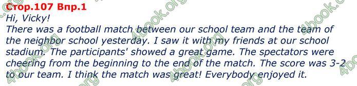 Привіт, Вікі. Відбувся футбольний матч наша шкільна команда та тенок. сусідньої школи вчора. Я бачив це з друзями на нашому шкільному стадіоні. Учасники показали чудову гру. Глядачі вболівали від початку до кінця матчу. Рахунок 3:2 на користь нашої команди. Я вважаю, що матч був чудовий! Всі отримали задоволення.