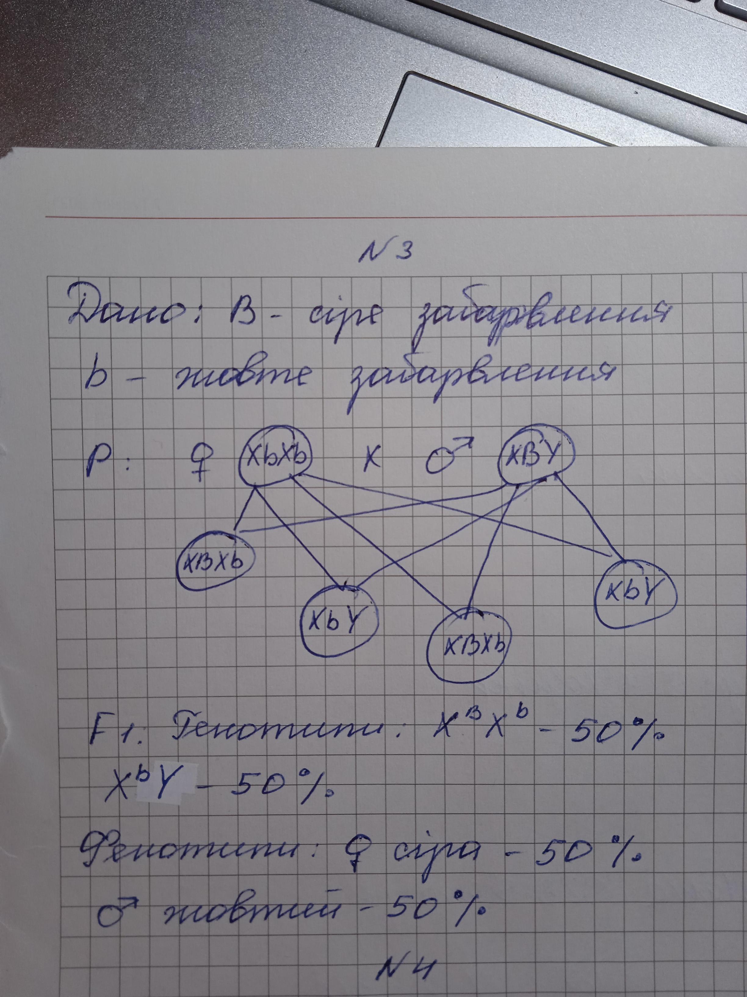 У задачі три на ознаку, зчеплену зі статтю, відбувається відношення фенотипу за принципом 50% на 50%, що характерне для ознак, зчеплюванихзі статтю