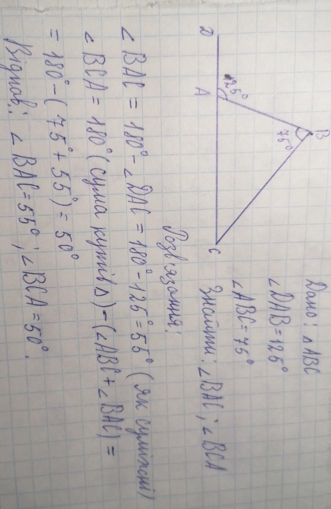Зовнішній кут трикутника дорівнює 125, а один із внутрішнії, не суміжних з ним, 75. Знайти невідомі кути трикутника.