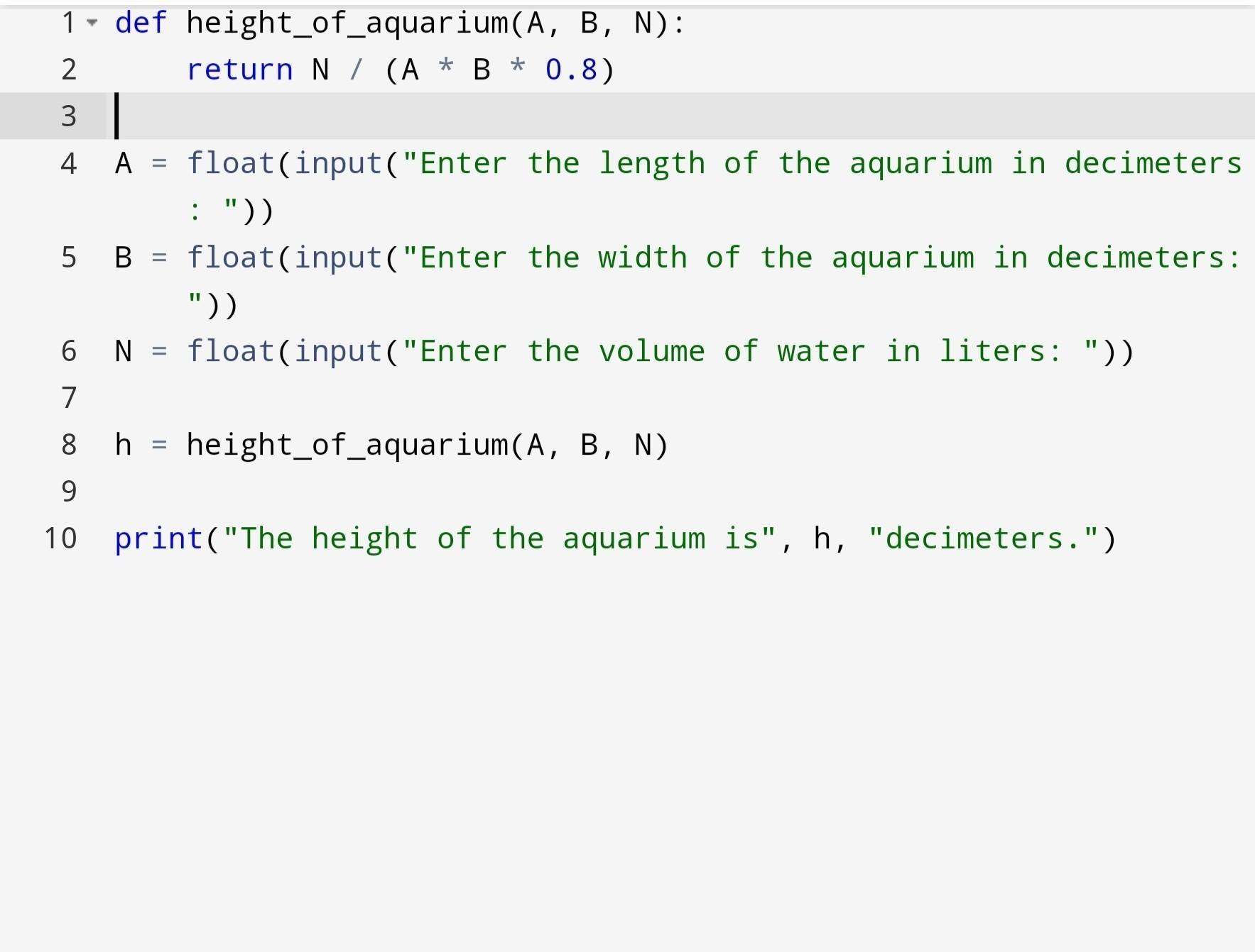 A = float(input("Enter the length of the aquarium in decimeters: "))