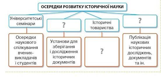 Ответ: У яких центрах розвивалася історична наука? Центрами розвитку історичної науки в українських землях спочатку були університети: Львівський університет (заснований у 1661 р.), Харківський університет (заснований в 1805 р.), Університет Святого Володимира в Києві (1834 р.), Новоросійський університет в Одесі (1865 р.).