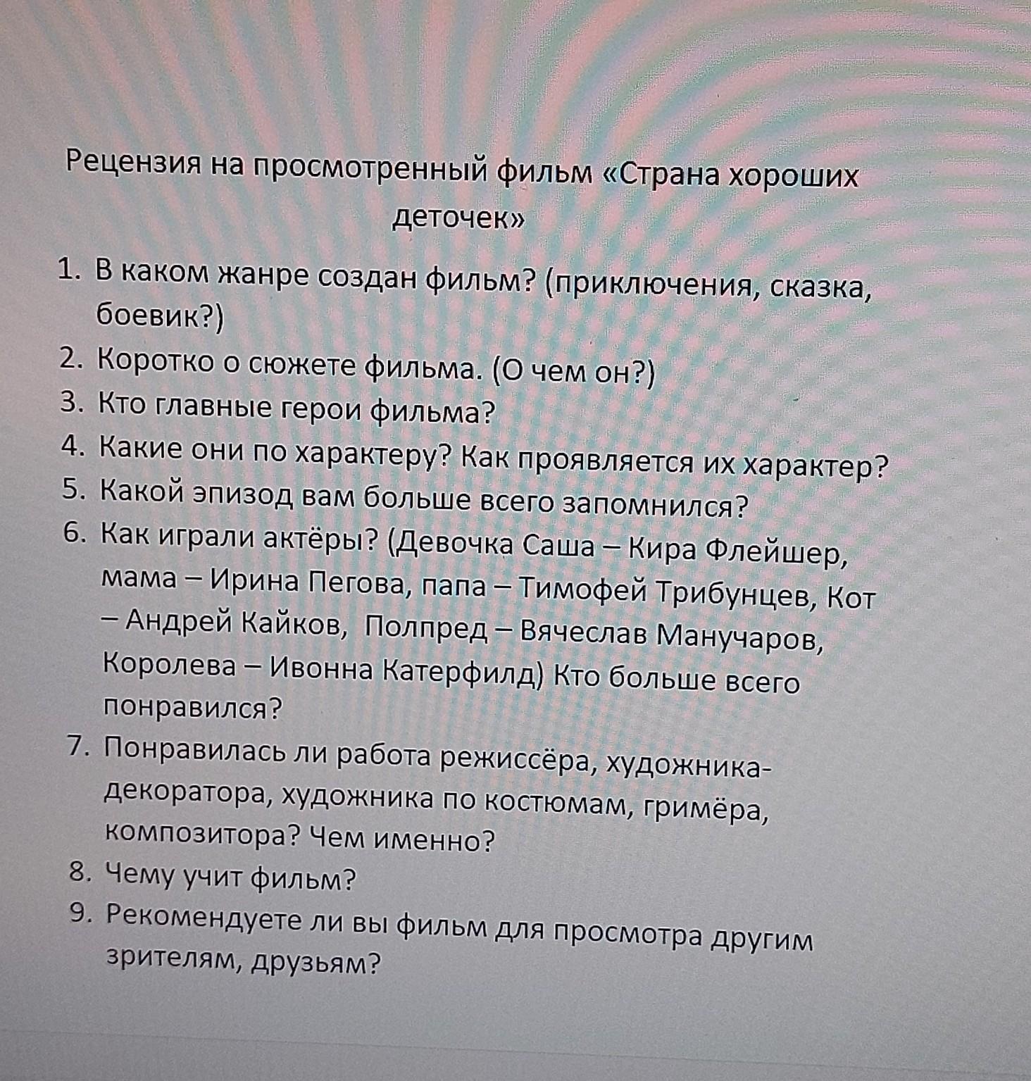 3. Кто главные герои фильма? - Девочка Саша, мама, папа, кот, полпред, королева, дедушка, бабушка, часовщик, дед мороз, сторож границы времени