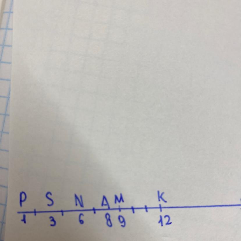 накресліть координатний промінь з одиничним відрізком 1 клітина,відмітьте на ньому точки A(8),K(12),P(1),M(9),N(6),S(3)