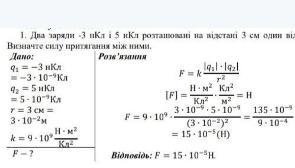 Два заряди - 3 нКл і 6 нКл розташовані на відстані 3 см один від одного. Визначте силу притягання між ними
