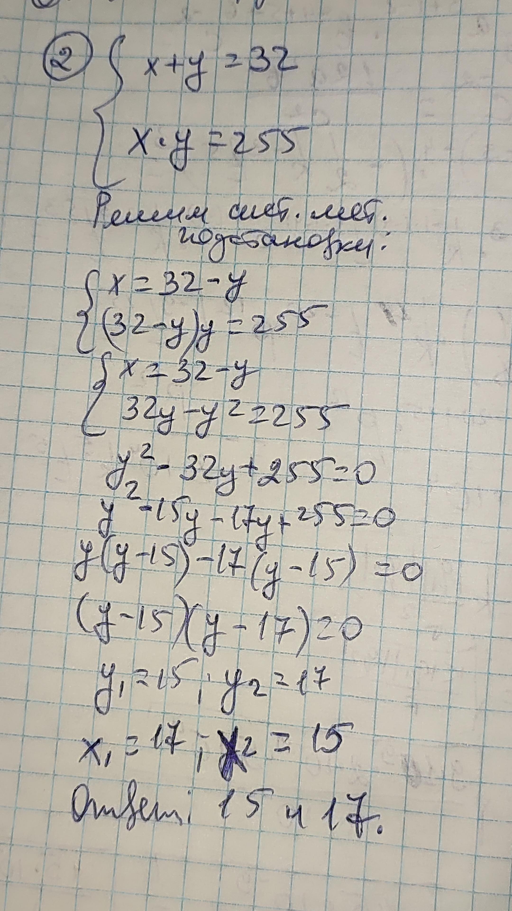 № 2. Сума двох чисел дорівнює 32, а добуток - 255. Знайдіть ці числа.