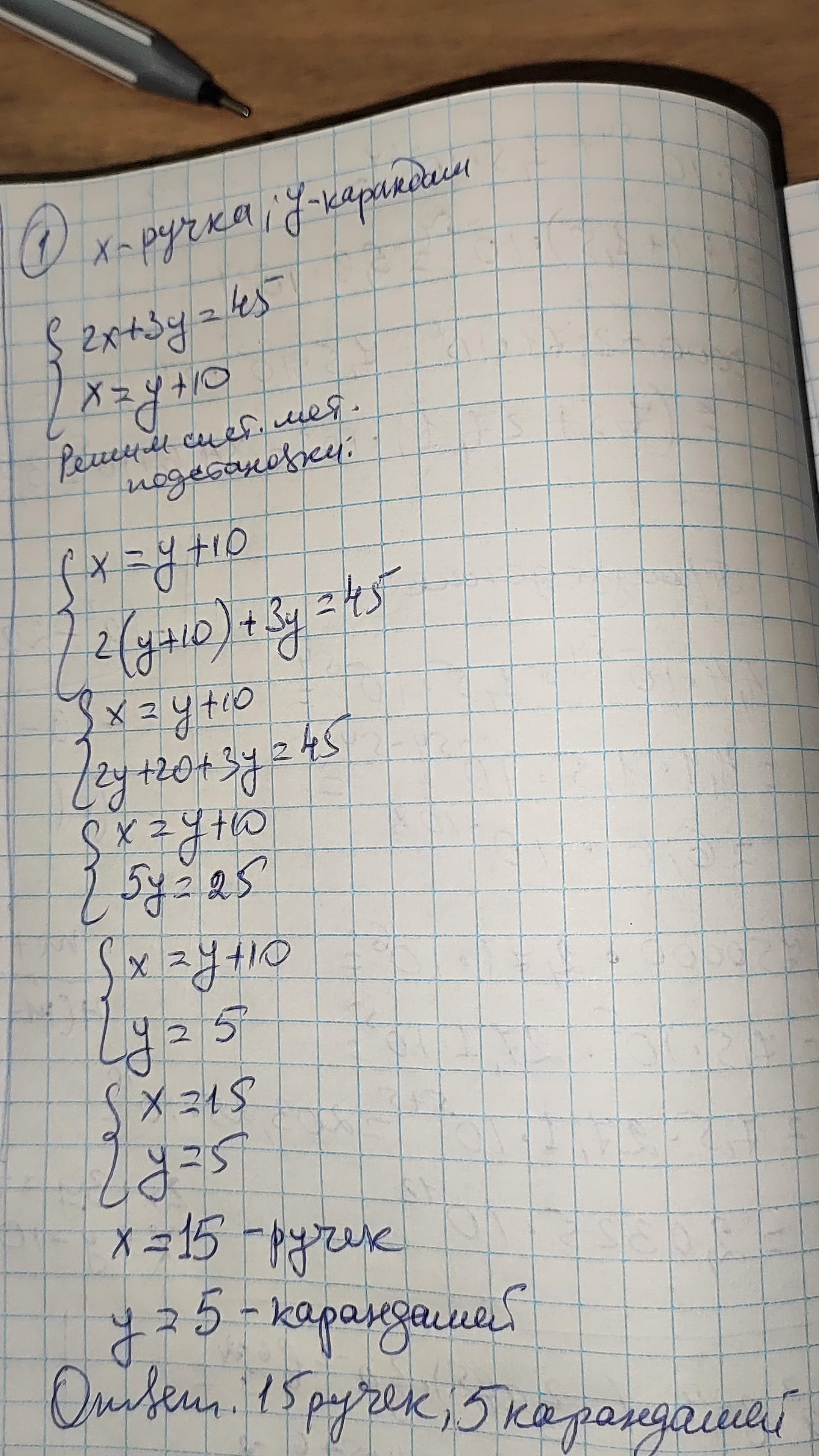 ДАЮ 45 БАЛОВ НА ТОТ ЖЕ ВОПРОС ГДЕ НЕ УКАЗАЛ 55 МОЖНО РЕШИТЬ И КОПИПАСТНУТЬ ТУТ № 1. За дві ручки і три олівця заплатили 45 гривень. Ручка дорожча від олівця на 10 гривень. Скільки коштує ручка і скільки коштує олівець?