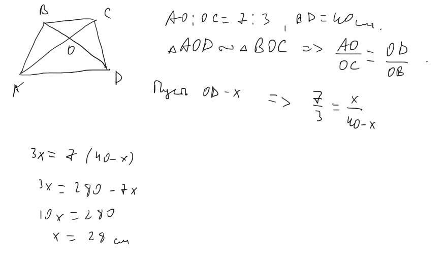У трапеції АВCD з основами AD i ВС діагоналі перетинаються в точці О, АО:OC=7:3, BD=40 см. Знайти довжину відрізка OD.