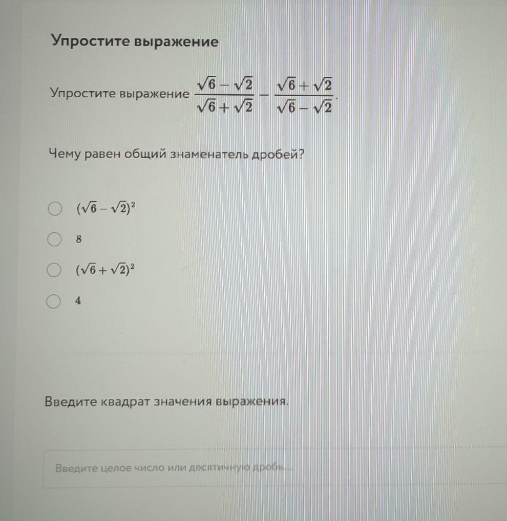 Задание: 1) чему равен общий знаменатель дробей; 2) введите квадрат значения выражения
