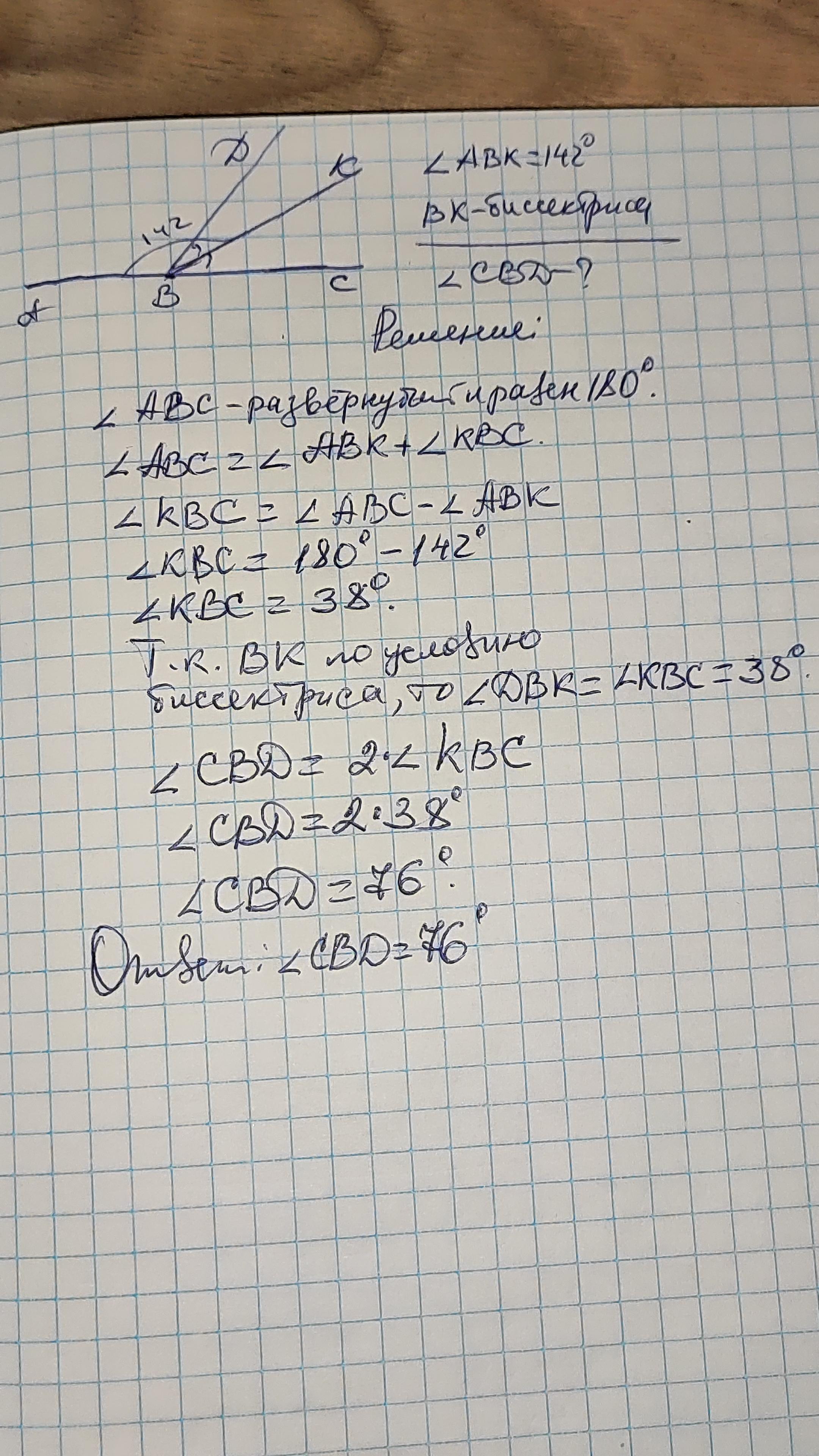 Промінь ВК є бісектрисою кута CBD, < ABK = 142°. Знайдіть кут СBD.
