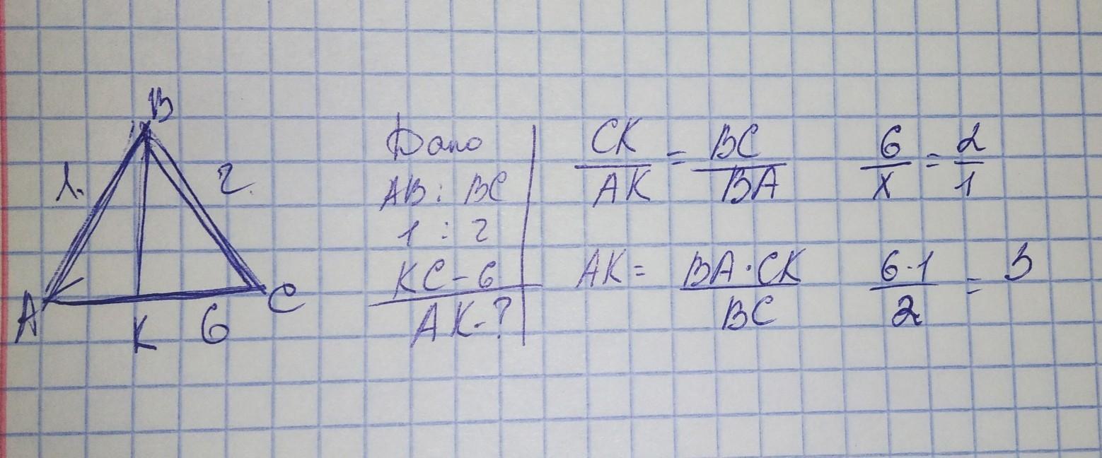 ВК - бісектриса трикутника АВС, АВ: ВС = 1 : 2, КС = 6 см. Знайдіть АК.