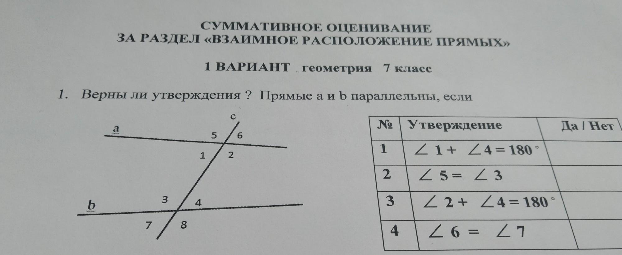 1 ВАРИАНТ геометрия 7 класс 1. Верны ли утверждения ? Прямые а и b параллельны, если № Утверждение №o 1 2 3 4 b a 7 3 8 1 4 5 C 2 6 21+ 24 = 180° 25 = 23 22+ / 6 = = 24 = 180 L1 0 да / Не