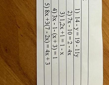 HI 2 1) 14-y-19-11y 2) 7x10 2 - 4x 3) 1,2x+1=1 -x 4) 3x - 1- (x + 3) = 1 5) 8x +3(7- 2x) = 4x + 3