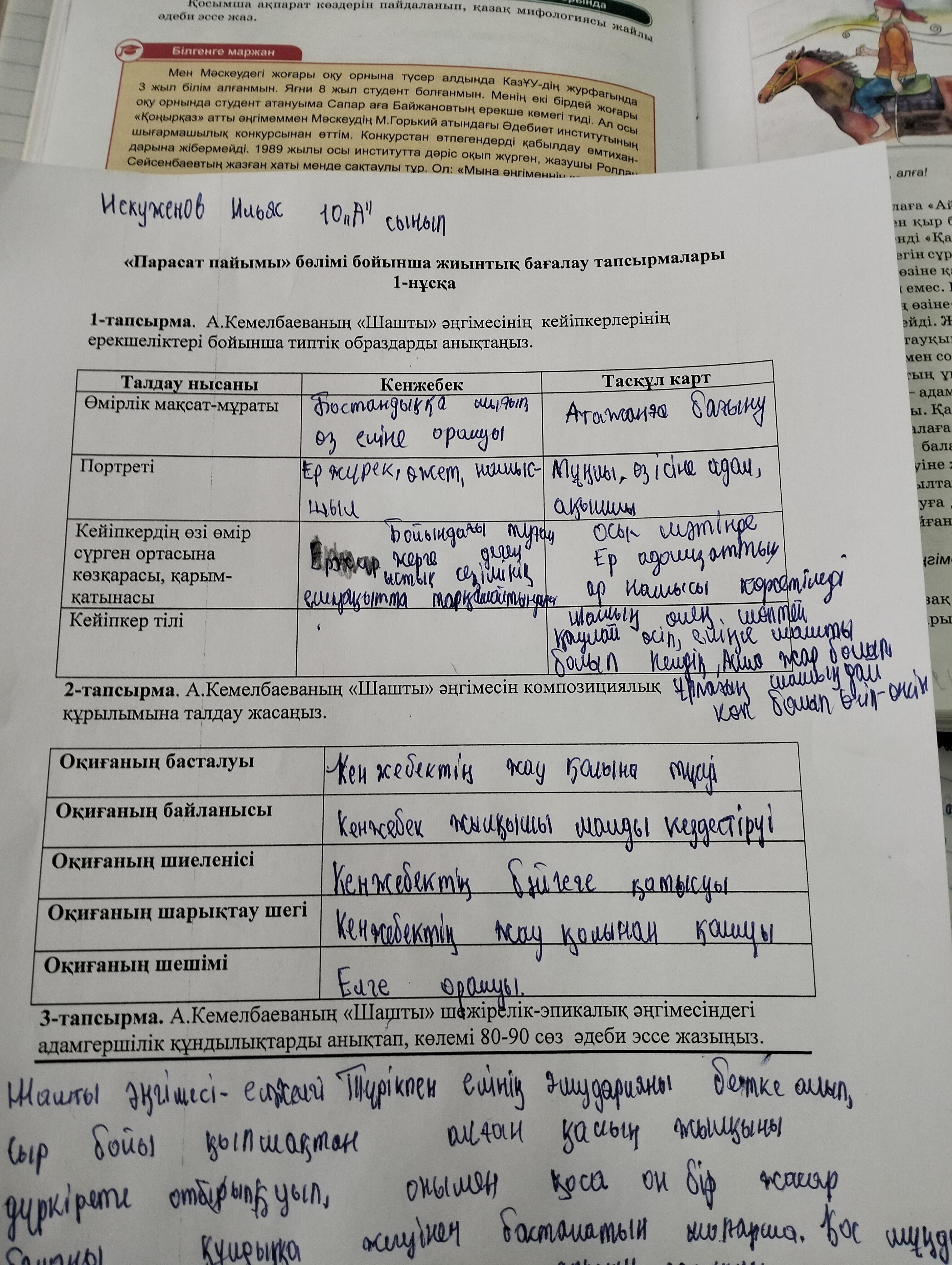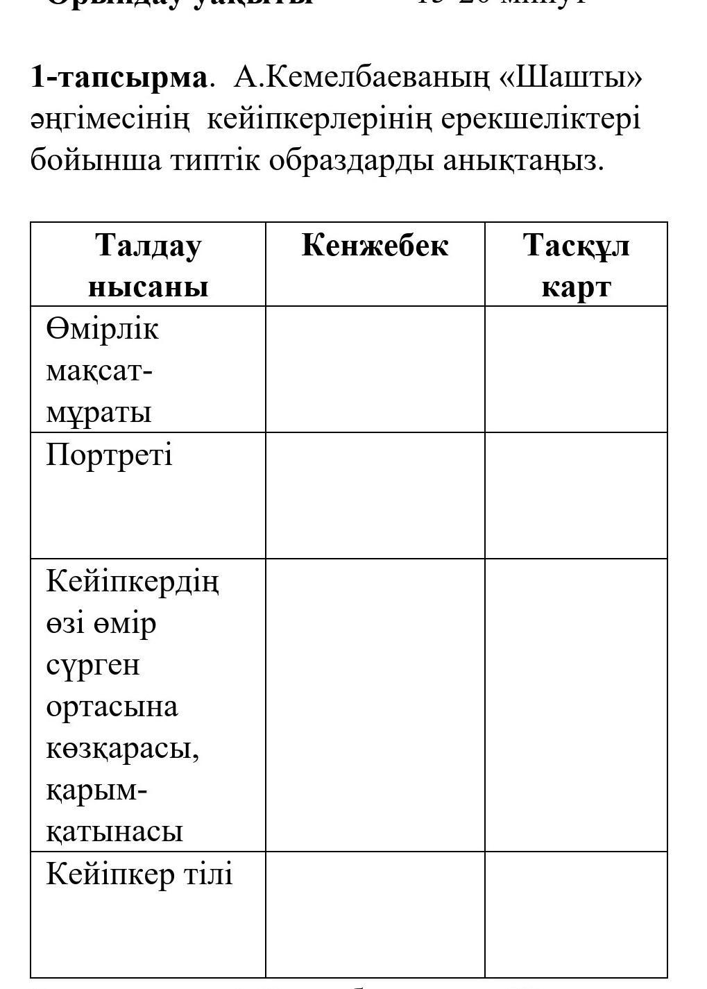 1-тапсырма. А.Кемелбаеванын «Шашты» әңгімесінің кейіпкерлерінің ерекшеліктері бойынша типтік образдарды анықтаңыз.