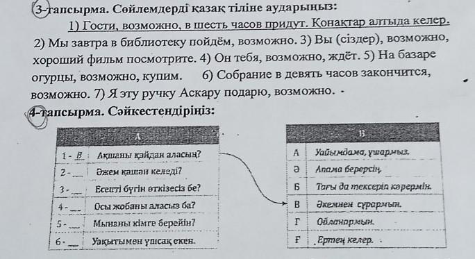 3-тапсырма. Сөйлемдерді қазақ тіліне аударыңыз: 1) Гости, возможно, в шесть часов придут. Қонақтар алтыда келер. 2) Мы завтра в библиотеку пойдём, возможно. 3) Вы (сіздер), возможно, хороший фильм посмотрите. 4) Он тебя, возможно, ждёт. 5) На базаре огурцы, возможно, купим. 6) Собрание в девять часов закончится, возможно. 7) Я эту ручку Аскару подарю, возможно. - 4-тапсырма. Сәйкестендіріңіз: 1 1- В Ақшаны кайдан аласың? 2- Әжем қашан келеді? Есепт) бугiн өткiзесіз бе? Осы жобаны аласыз ба? Мынаны кiмге берейiн? Уакытымен ушсақ екен. 3- 5- 6- Srenerne erre ren B Уайымдама, ушармыз. Апама берерсің. Тағы да тексеріп көрермін. Әкемнен сурармын. Ойданармын. A Ә Б B Г F Ермен келер.