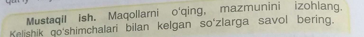 1. Qilganing menga, o'rganganing o'zingga. 2. Ko'p o'qigan ko'p bilar. 3. Ilmni mehnatsiz egallab bo'lmas. 4. Ilm olish - ignada quduq qazish bilan barobar. СРОЧНО ПОЖАЛУЙСТА ДАМ 50 БАЛЛОВ