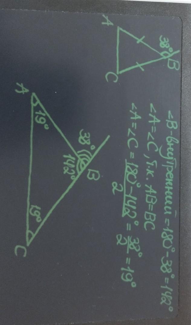 По т о внешнем угле 38=<А+<С, учтём, что ∆АВС- равнобедренный, <С=38:2=19