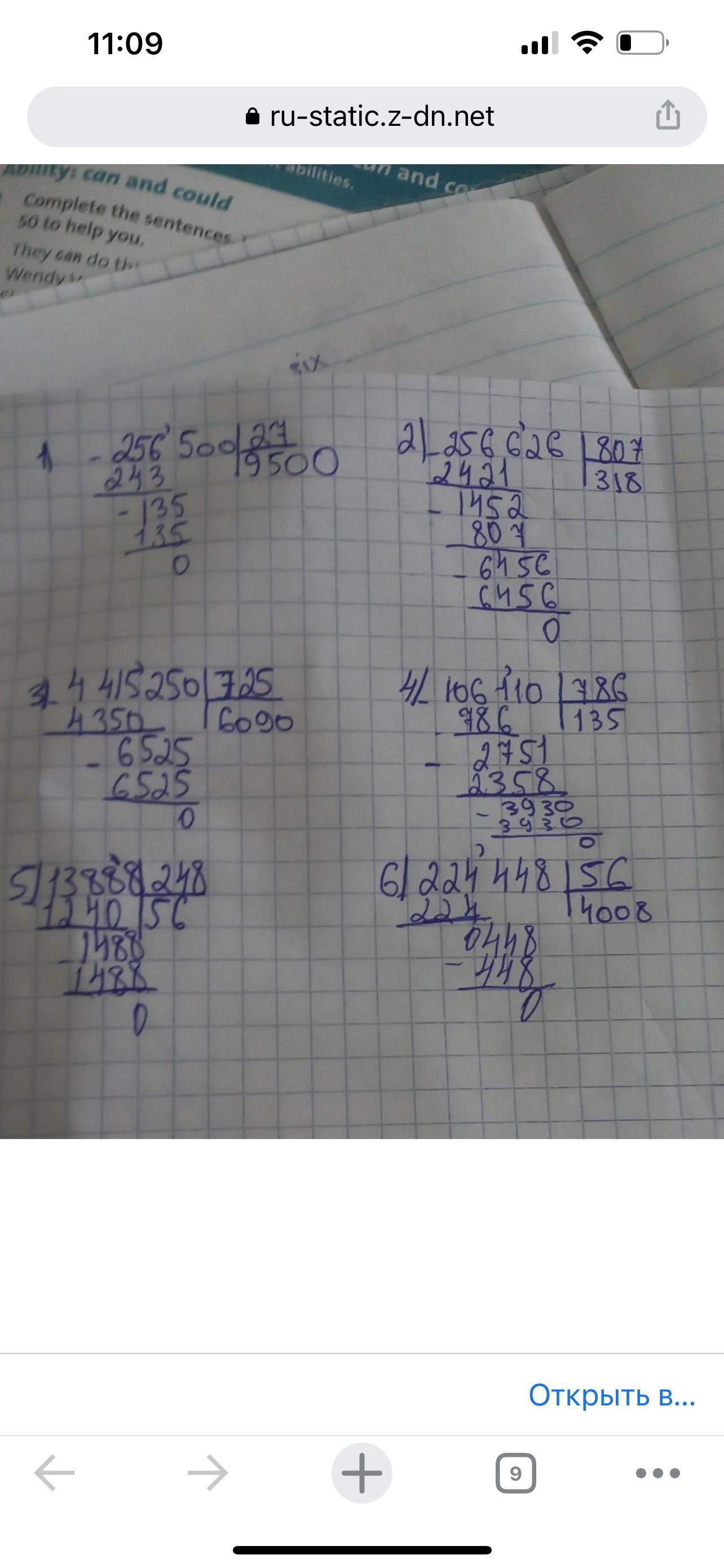 5 РАБОТА В ПАРЕ Вычисли с проверкой. 256 500:27 106 110: 786 256 626: 807 13 888: 248 4 415 250:725 224 448:56 пожааалуйста с фотку