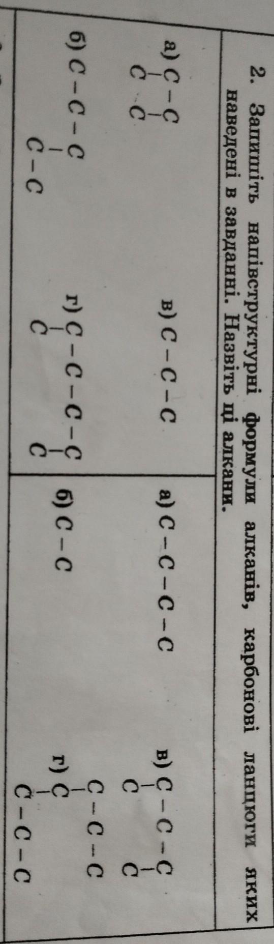 Запишіть напівструктурні формули алканів, карбонові ланцюги яких наведені в завданні. Назвіть ці алкани.