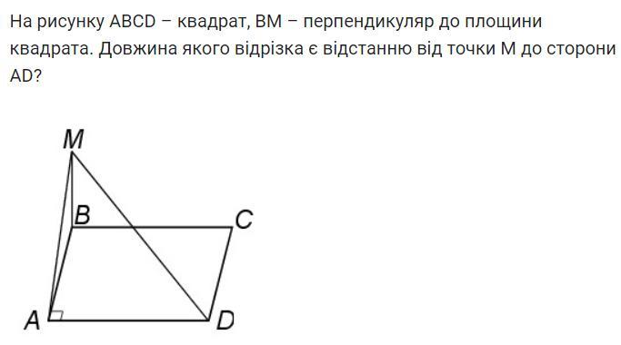 На рисунку ABCD – квадрат, ВМ – перпендикуляр до площини квадрата. Довжина якого відрізка є відстанню від точки M до сторони AD?Даю 50 балів, фото прикріпив