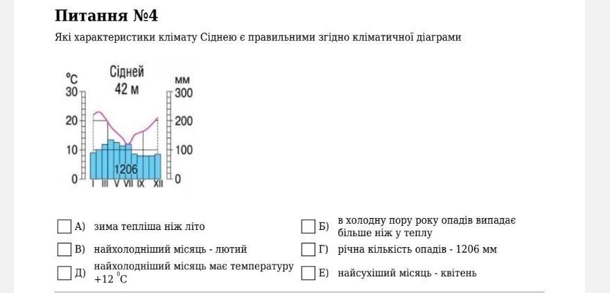 30 20 10 0 Сідней 42 м 1206 V VII IX XII MM 300 200 100 ¹0 А) зима тепліша нiж лiто в) найхолодніший місяць - лютий Д) найхолодніший місяць має температуру +12 °C в холодну пору року опадів випадає більше ніж у теплу Г) рiчна кількість опадів - 1206 мм Е) найсухіший місяць - квітень