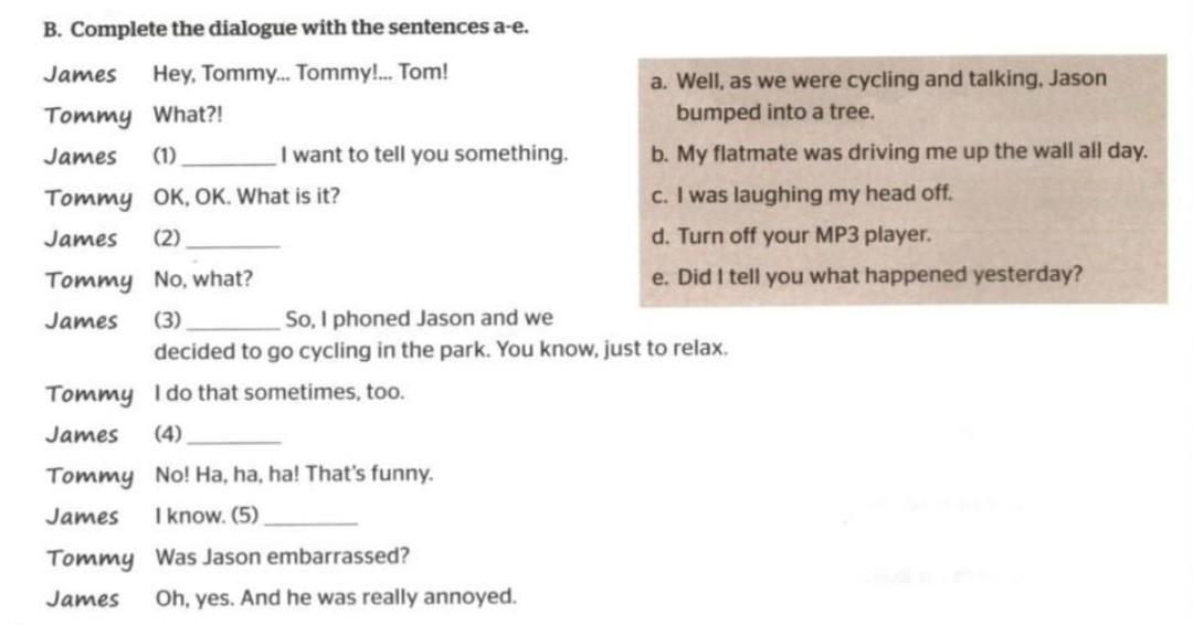 Джеймс: (3) Мой сосед (по квартире) вчера весь день действовал мне на нервы. Ну, я позвонил Джейсону, и мы решили покататься на велосипедах в парке. Знаешь, чтоб расслабиться.