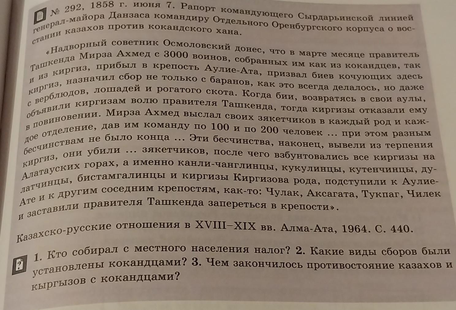 Надворный советник Осмоловский донес, что в марте месяце правитель Ташкенда Мирза Ахмед с 3000 воинов, собранных им как из кокандцев. так стани и из киргиз, прибыл в крепость Аулие-Ата, призвал биев кочующих здесь киргиз, назначил сбор не только с баранов, как это всегда делалось, но даже с верблюдов, лошадей и рогатого скота. Когда бии, возвратясь в свои аулы. объявили киргизам волю правителя Ташкенда, тогда киргизы отказали ему в повиновении. Мирза Ахмед выслал своих зякетчиков в каждый род и каж- дое отделение, дав им команду по 100 и по 200 человек ... при этом разным Эти бесчинства, наконец, вывели из терпения бесчинствам не было конца ... зякетчиков, после чего взбунтовались все киргизы на киргиз, они убили латчинцы, бистамгалинцы и киргизы Киргизова рода, подступили к Аулие- Алатауских горах, а именно канли-чанглинцы, кукулинцы, кутенчинцы, ду- Ате и к другим соседним крепостям, как-то: Чулак, Аксагата, Тукпаг, Чилек и заставили правителя Ташкенда запереться в крепости. Казахско-русские отношения в XVIII-XIX вв. Алма-Ата, 1964. C. 440. 1. Кто собирал с местного населения налог? 2. Какие виды сборов были установлены кокандцами? 3. Чем закончилось противостояние казахов и кыргызов с кокандцами? ...