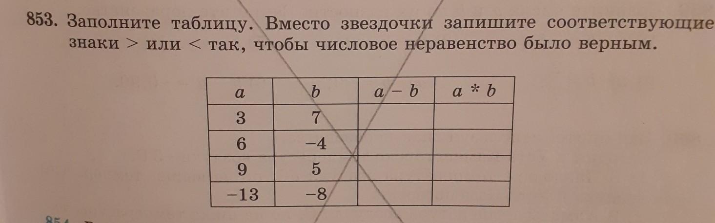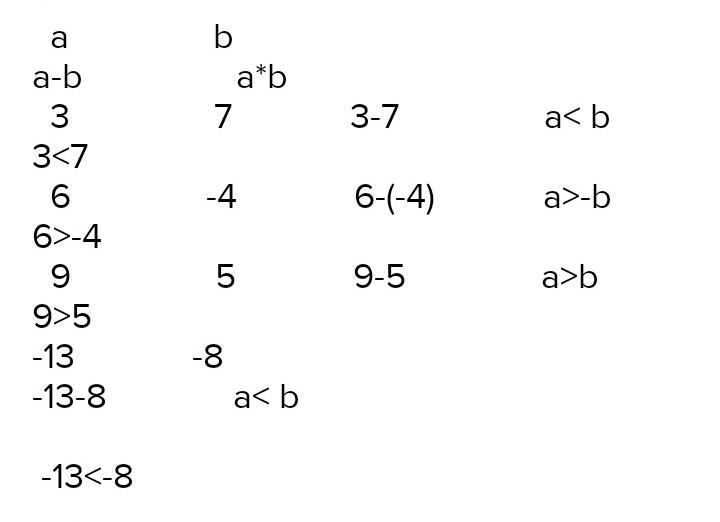 Заполните таблицу. Вместо звездочки запишите сос знаки > или < так, чтобы числовое неравенство было A. Выполните дей a 3 6 9 -13 b 7 -4 5 -8 a - b a * b