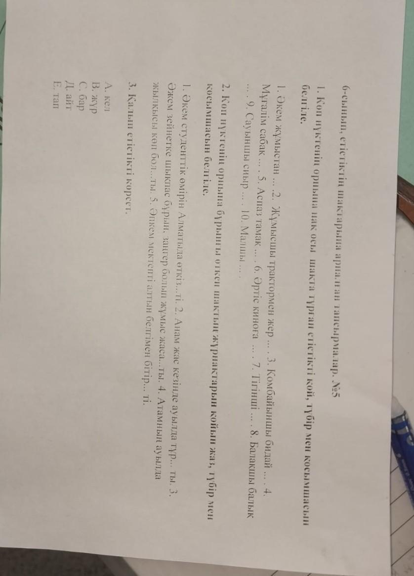 1келді.2аударды.3жинады.4оқытты.5пісірді.6түсті.7тікті.8аулады.9сауда.10бақты