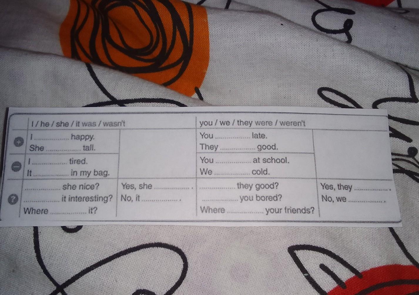 1/he/she/it was/ wasn't happy. Sho Where tired. in my bag, she nice? it interesting? it? Yes, she No, it you/ we/ they were / weren't late. They You We Where good. at school cold. they good? you bored? your friends? Yes, they No, we