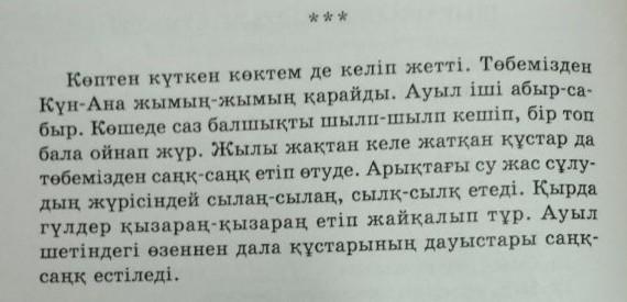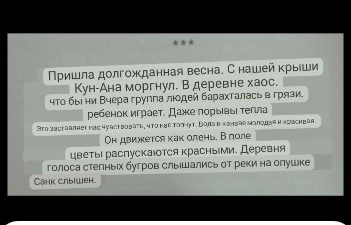 Пришла долгожданная весна. Кун-Ана наблюдает с нашей крыши. В деревне хаос. Группа детей играет в коше, играет с глиной. Порывы ветра из теплой области также проходят мимо. Вода в канаве течет, как юная красавица. Цветы распускаются красными по краю. С реки на окраине села слышны голоса степных бугров.