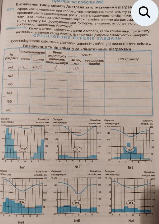 Пам’ятайте, що пори року (літо і зима) в північній та південній півкулях прямо протилежні, тому на кліматичних діаграмах Північної півкулі температура повітря завжди підвищена в липні, Південної півкулі – у січні.