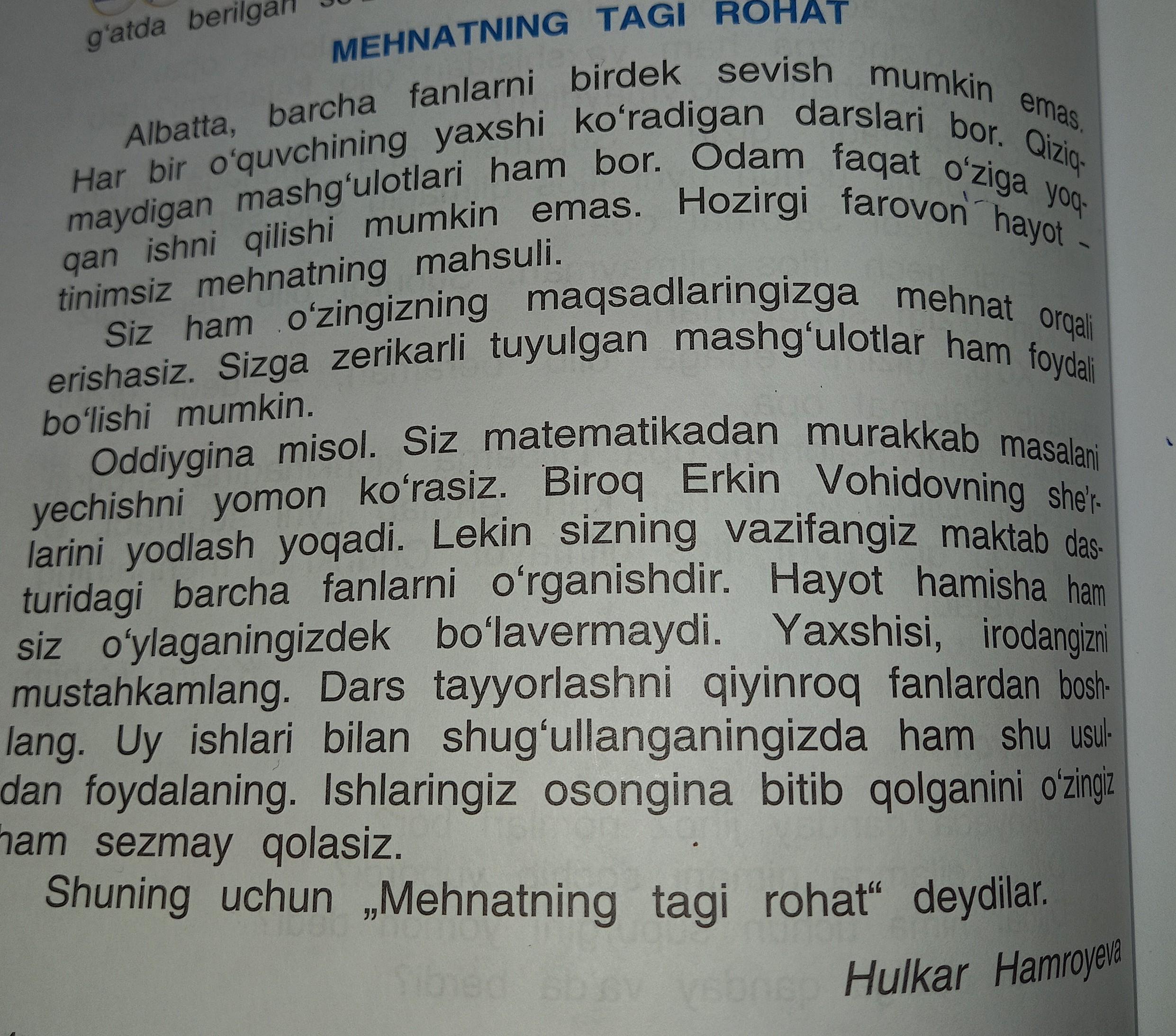 Albatta , barcha fanlarni birdek sevish mumkin emas . Har bir oʻquvchining yaxshi koʻradigan darslari bor . Qiziq maydigan mashg'ulotlari ham bor . Odam faqat o'ziga yoq qan ishni qilishi mumkin emas . Hozirgi farovon hayot tinimsiz mehnatning mahsuli . Siz ham o'zingizning maqsadlaringizga mehnat orqali erishasiz . Sizga zerikarli tuyulgan mashg'ulotlar ham foydali bo'lishi mumkin . Oddiygina misol . Siz matematikadan murakkab masalani yechishni yomon ko'rasiz . Biroq Erkin Vohidovning she'r larini yodlash yoqadi . Lekin sizning vazifangiz maktab das turidagi barcha fanlarni o'rganishdir . Hayot hamisha ham siz o'ylaganingizdek boʻlavermaydi . Yaxshisi , irodangizni mustahkamlang . Dars tayyorlashni qiyinroq fanlardan bosh lang . Uy ishlari bilan shug'ullanganingizda ham shu usul dan foydalaning . Ishlaringiz osongina bitib qolganini o'zingiz ham sezmay qolasiz . Shuning uchun „ Mehnatning tagi rohat " deydilar . Lug’at suzlari: birdek,faqat,o’ziga,maqsad,sezmay qolmoq,faravon hayot,mehnat mahsuli,zerikarli tuyulmoq.