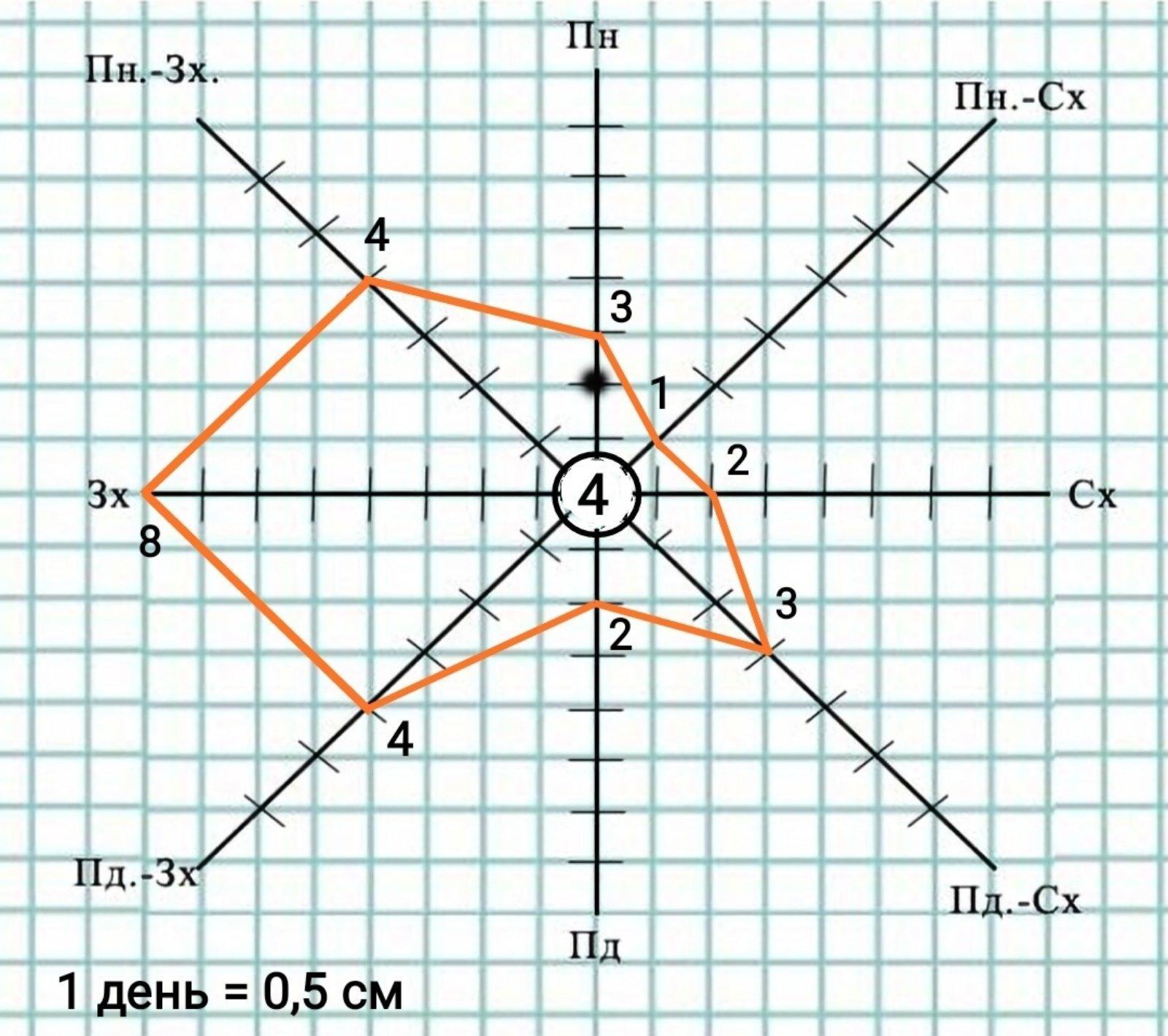 Використовуючи дані «Календаря погоди», по кожному напрямку від центру в сторону, куди дме вітер, відзначте в масштабі кількість днів, протягом яких переважав вітер певного напряму. Можна вибрати будь-який зручний масштаб, наприклад, 1 день прийняти за 0,5 см. Якщо, наприклад, вітер південно-західного напрямку дув протягом місяця 5 днів, то необхідно від центру графіка по лінії, яка спрямована на південний захід, відкласти 2,5 см і зробити позначку.