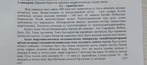 2-тапсырма. Карамен берілген сойлемге морфологиялык талдау жасау. Су-тіршілік көзi Жер шарында жыл сайын 400 мын км3 шамасында су буга айналып, жогары көтерiледi екен. Казакстандагы су ресурстарынын негiзi -озен сулары болып есептеледі, орташа жылдык мелшері - 100 км3, 43 пайызы Кытай, Өзбекстан, Кыргызстан, Ресей мемлекеттерiне келеді. Республикамызда таза ауыз сумен камтамасыз ету мардымсыз. Жоспарланган жендсу, калпына келтiру жумыстары жургiзiлмейдi. Коптеген ауылдык су откiзгiштерiнде су залалсыздандырылмайды. Казiргi кезде Республикамыздагы барлык iрi озендер - Тле, Сырдария, Жайык, Ертіс, Шу, Талас ластанган. Тенiз бен мұхиттар мұнаймен ластануда. Бұл қоршаған ортага ете кауiптi. Сулагы балыктар кырылып, калу каупi жылдан жылға әсiп келедi. Ауыл шаруашылығында колданылатын минералды тыңайтқыштардын артык мөлшері топырактан шайылып, өзен, көлдерге, тенiзге түсуде. Бул судагы оттектi азайтады. Сонымен бірге бұл балык ондiрiсiне катты әсерiн тигiзiп, балык аулау азайып кеткенiн айтылып жүр. Мысалы, тiстi екi мезгіл тазалау кезiнде 4 литрден 8 литр су кетедi скен, тамак әзірлеуге 3 мезгiлде бас-аягы 10 литр су кетеді екен. Суға түссен орта есеппен 10 - 15 литр су жумсайсын. Сонда кунiне 33 - 38 литрдей су кетеді екен. Бул бiр балага кететiн бiр кундiк су мөлшері. (223 c03)