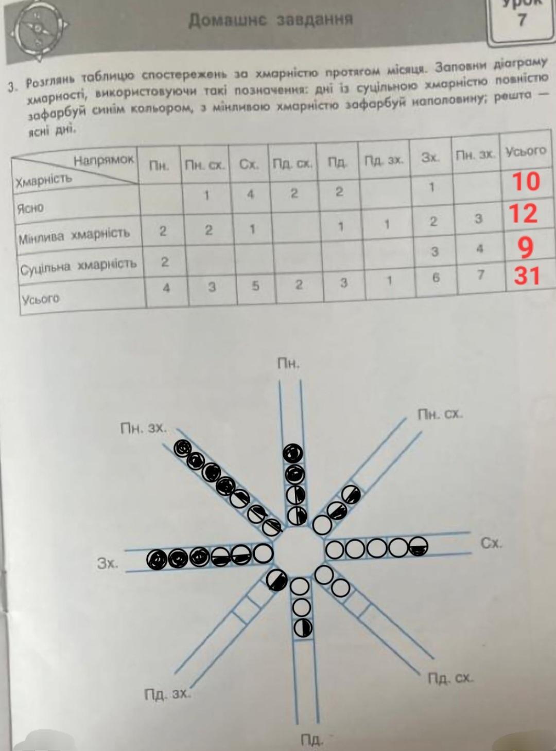 113. Розглянь таблицю спостережень за хмарністю протягом місяця. Заповни діаграму хмарності, використовуючи такі позначення: дні із суцільною хмарністю повністю зафарбуй синім кольором, з мінливою хмарністю зафарбуй наполовину, решта ясні дні.