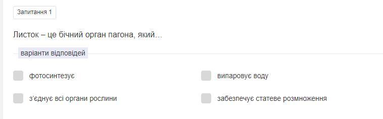 Листок - це бічний орган пагона. Основними функціями є фотосинтез, транспірація, газообмін. Фотосинтез - процес, під час якого утворюються органічні речовини із неорганічних (з участю енергії світла). Транспірація - випаровування води. Газообмін - надходження і виділення вуглекислого газу і кисню під час фотосинтезу і дихання